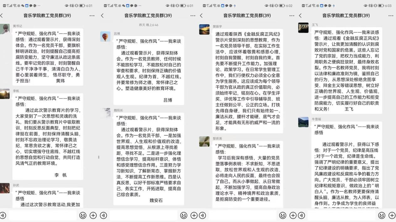 随后,大家集体观看了陕西《金融反腐正风纪》警示片,并在党员工作群中积极参加“严守规矩、强化作风——我来谈感悟”接龙活动。大家纷纷表示,在今后工作中,要提高思想觉悟,从根源上寻找差距,寻找不足。要警钟长鸣,守住底线,不碰红线。立足本职岗位,铭记责任与使命,认真负责的对待每一位学生,以优异成绩迎接党的二十大胜利召开。