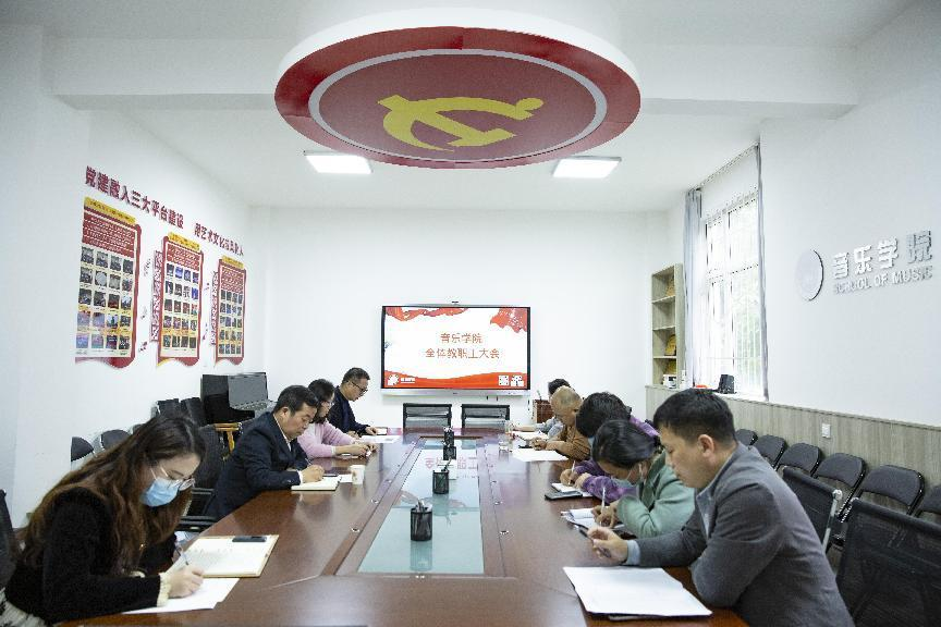 10月26日,音乐学院召开全体教职工大会,总结开学以来的各项工作,安排部署期中教学检查工作。党委书记黄玮,副书记、副院长樊振宇,副院长王飞及全体教职工线下、线上参加了会议。会议由院长魏安石主持。