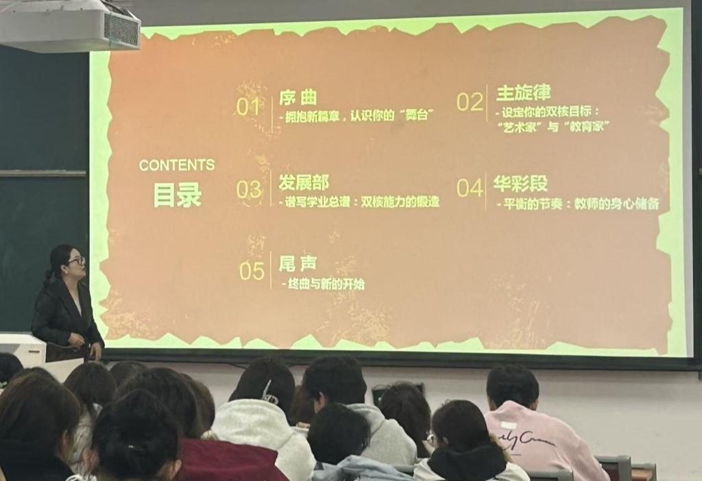 讲座在“尾声——终曲与新的开始”中走向高潮,刘萍老师寄语新生:“大学四年是你们谱写人生乐章的关键时期,愿你们以‘艺术家’的执着打磨技艺,以‘教育家’的情怀扎根教育,在宝鸡文理学院的舞台上奏响最动人的成长旋律。”