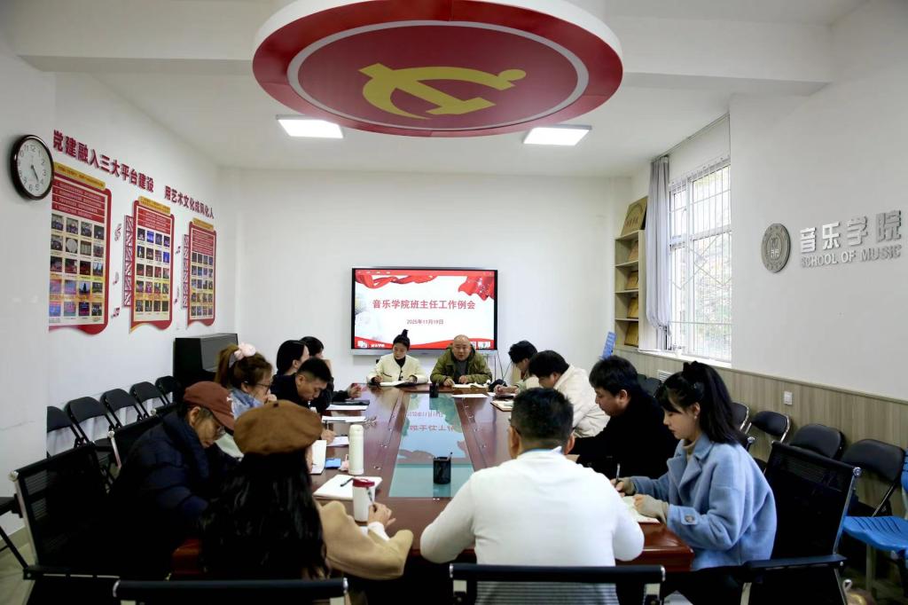 为进一步加强辅导员、班主任队伍建设,持续提升班级管理效能,助力学生成长成才,11 月 19 日,音乐学院召开班主任工作例会。学院党委副书记、副院长樊振宇主持会议,全体辅导员、班主任参会。