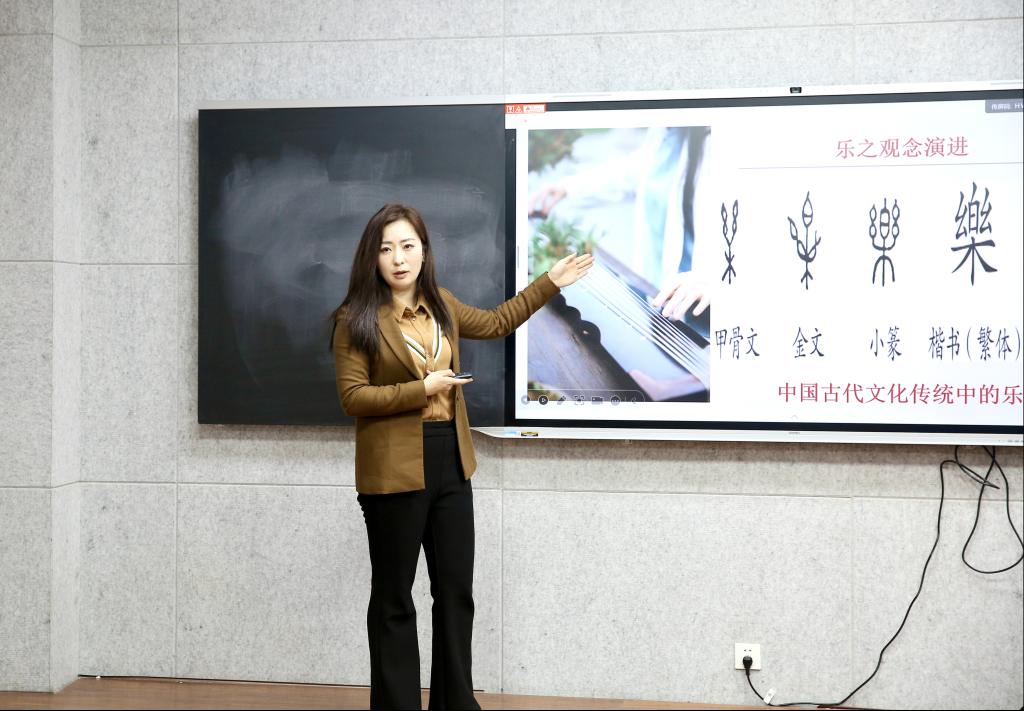 孙小迪以中华乐教的历史脉络与文化根基为切入点,围绕乐的意义、乐教内容、乐教制度以及乐教理想四大核心进行系统阐释。她结合经典文献与历代乐教实践,梳理中华乐教“以乐育人、以美润心”的核心理念,深入解读乐在修身、齐家、治国、平天下中的重要价值,系统梳理历代乐教制度的建构与演进,清晰呈现乐教在国家教化体系中的重要地位。同时,详细讲解传统乐教的核心内容与艺术范式,阐明乐教“尽善尽美”的终极追求与“以乐同和”的精神内核,引导师生从文化根源上理解中华美育的精神特质。孙小迪旁征博引、深入浅出,通过理论阐释与案例分析相结合,生动展现了中华乐教传统的深厚底蕴与当代价值,为在场师生理解乐教与美育的共生关系、把握传统艺术的审美精髓提供了清晰路径。